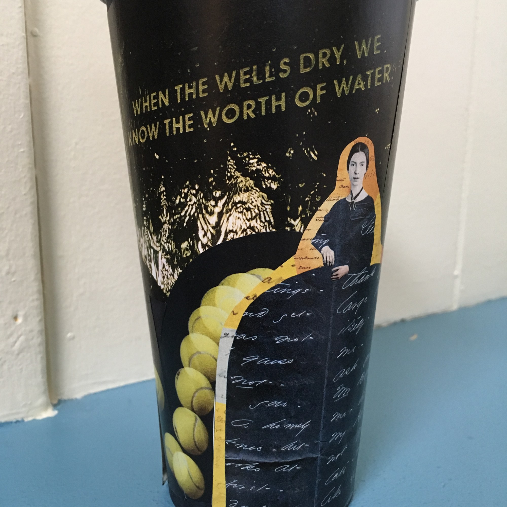 Back in December 2017, I entered a coffee cup decorating contest at a local coffee shop. I don’t have much in the way of painting or drawing skills, so I decided to do a collage design. I got out a pair of scissors, some magazines, and a can of spray adhesive, and I was quite pleased with how my cup turned out. (I did not win the contest.)