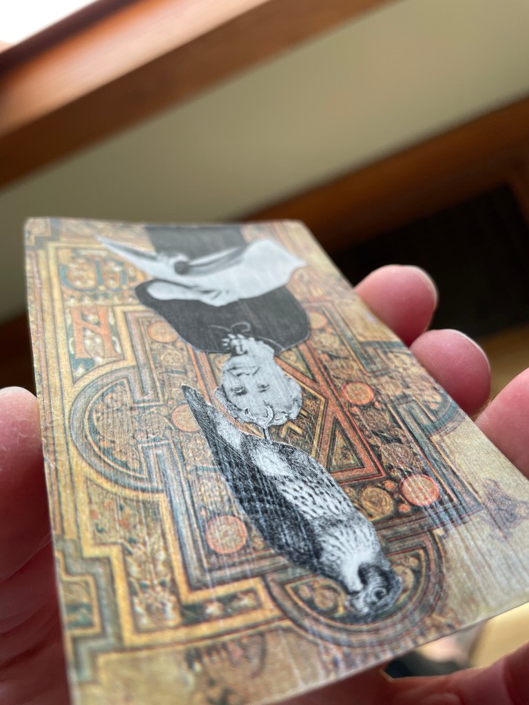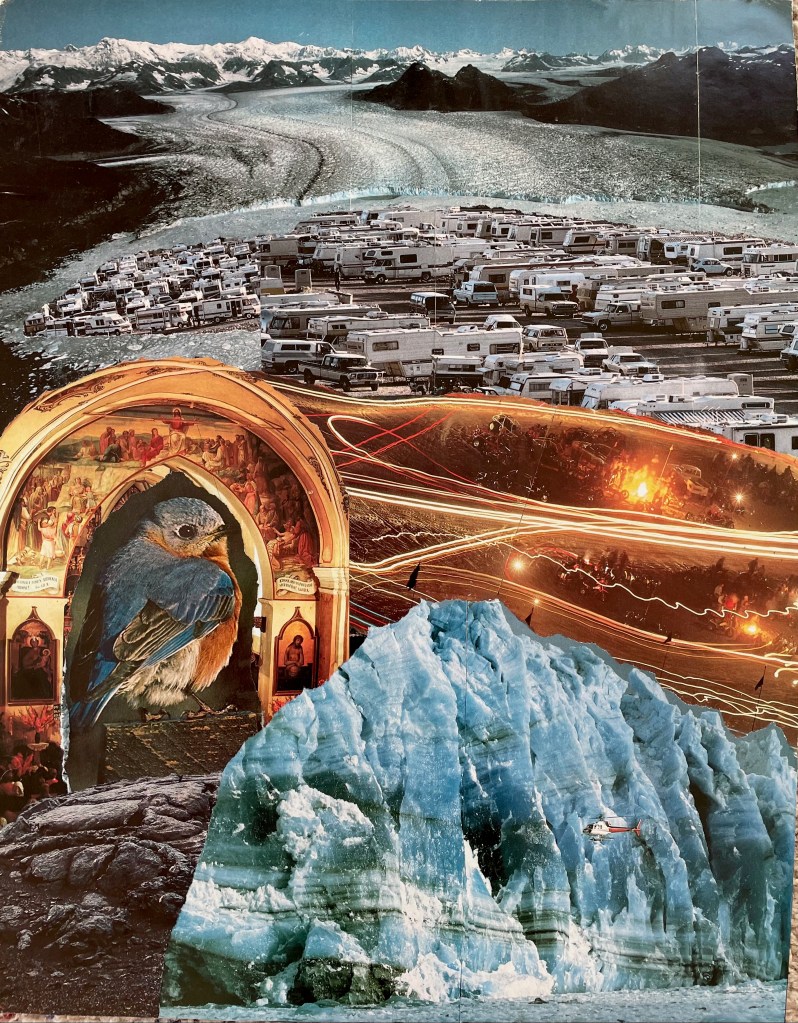 Then in October 2020 (oh, 2020!), I started another collage project as the result of an assignment in “The Artist’s Way” book, which I was undertaking as a writer. I remembered the paste brand I’d used in my collage class, but couldn’t remember the application technique. I turned to the Internet, and I cobbled together a technique, which I have been refining as my interest in collage work has increased.