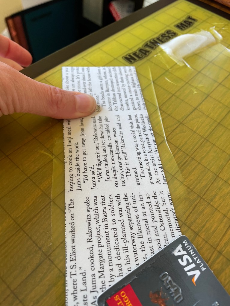 Instead, apply a decently thin layer of paste to your neatness mat, with sufficient area to accommodate the image. Gently set the image (face-up) into the paste, and use a small pointed dowel to poke the image to make sure all of it has contacted the glue. Use an x-acto knife to gently pry up an edge until you can grip it and carefully, carefully peel up your now-glued image. Here’s a photo of what the “paste patch” looked like on the neatness mat after I peeled up the image (the paste was actually a bit too thick here):
