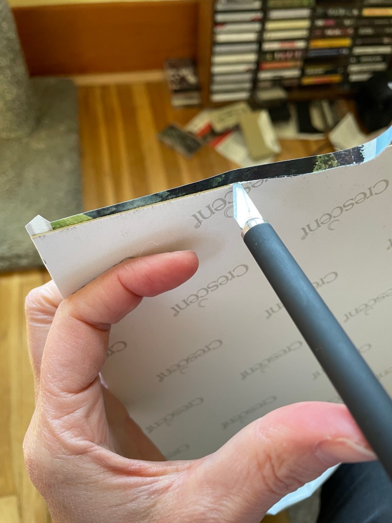 Step 3, tip 3 – shift to a clean portion of the mat, or use a clean mat / clean side of a mat, for each piece glued, so you don’t get glue on the front of the image or accidentally lose part of the image if it sticks to the glue on the mat.
