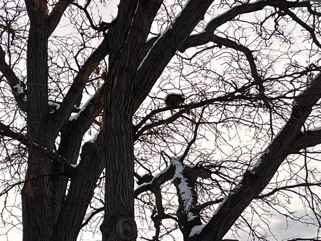 A warm morning. Didn’t need my mittens. Really quiet, too. Apart from a car with an apparent tire problem rolling by on a nearby street, the noisiest thing was the squirrels ripping around on a tree, their claws on the bark sounding like one of those rain sticks.